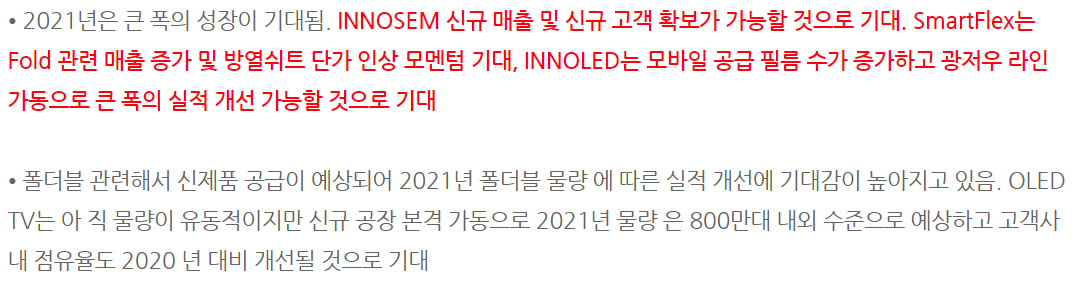 사실 매수이후에 큰 행보가 없어서 걱정하고 있었지만 4분기 영업이익이 3분기 대비 실적이 좋지 못해서 느린것으로 판단하고 계속 지켜봤다. 다른 분이 정리해놓은 증권사리포트 내용을 보니 2021년은 큰 폴의 성장이 기대되니 홀딩!