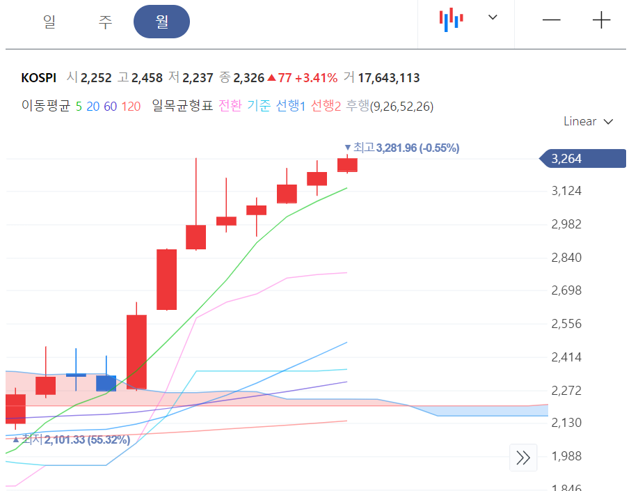 월봉차트로 봤을 때 11월 이후 꾸준히 우상향을 보여주고 있다. 하반기 장은 어디까지 오를까?