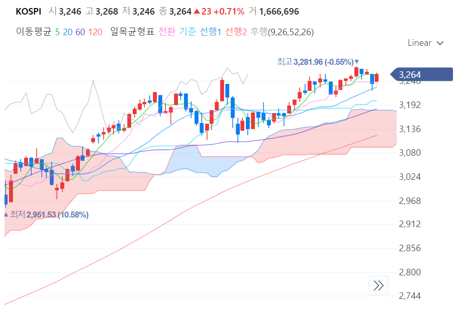 등락을 번갈아하다가 오늘 다시 코스피 3,263.88 전일대비상승 마감했다.